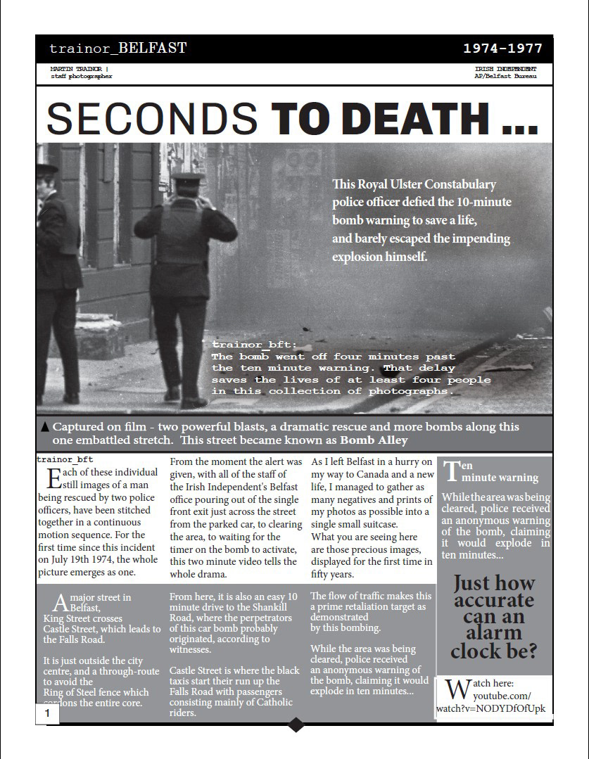 "Seconds To Death' is the vivid account of rescue from imminent destruction when a car bomb was left with just a 10 minute warning. The photos from that day are set in motion in this video. Read the full account in the tabloid edition. Click the Page for video.